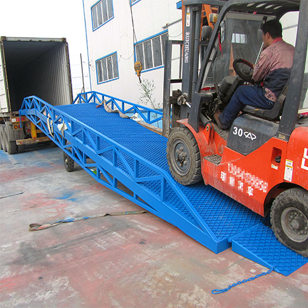 移動(dòng)登車橋是實(shí)現(xiàn)貨物快速裝卸的專用輔助設(shè)備,它的高度調(diào)節(jié)功能使貨車與庫房的貨臺之間架起一座橋梁,叉車等搬運(yùn)車輛通過它能直接駛?cè)胴涇噧?nèi)部進(jìn)行貨物的批量裝卸,僅需單人作業(yè),即可實(shí)現(xiàn)貨物的快速裝卸。移動(dòng)液壓登車橋使企業(yè)減少大量勞力,提高工作效率,獲取更大經(jīng)濟(jì)效益。臺面均設(shè)計(jì)為網(wǎng)格狀鋼板,這種結(jié)構(gòu)能保證具有很好的強(qiáng)度,又具有防滑功能,還能方便地清掃工作臺面,使它能經(jīng)常地保持清潔、美觀。移動(dòng)液壓登車橋無須外接電源,通過手搖泵做動(dòng)力能輕松地在其整個(gè)調(diào)整范圍內(nèi)按50mm的倍數(shù)進(jìn)行高度的調(diào)整。可以充分適應(yīng)各種不同高度的貨車.